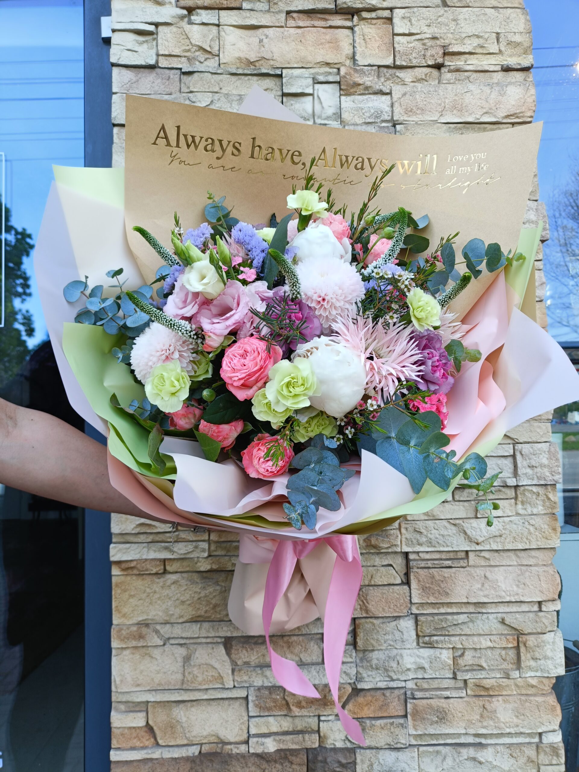 Szanowni Klienci informujemy, że ze względu na dostępność i sezonowość kwiatów, bukiet może się delikatnie różnić od przedstawionego na zdjęciu.