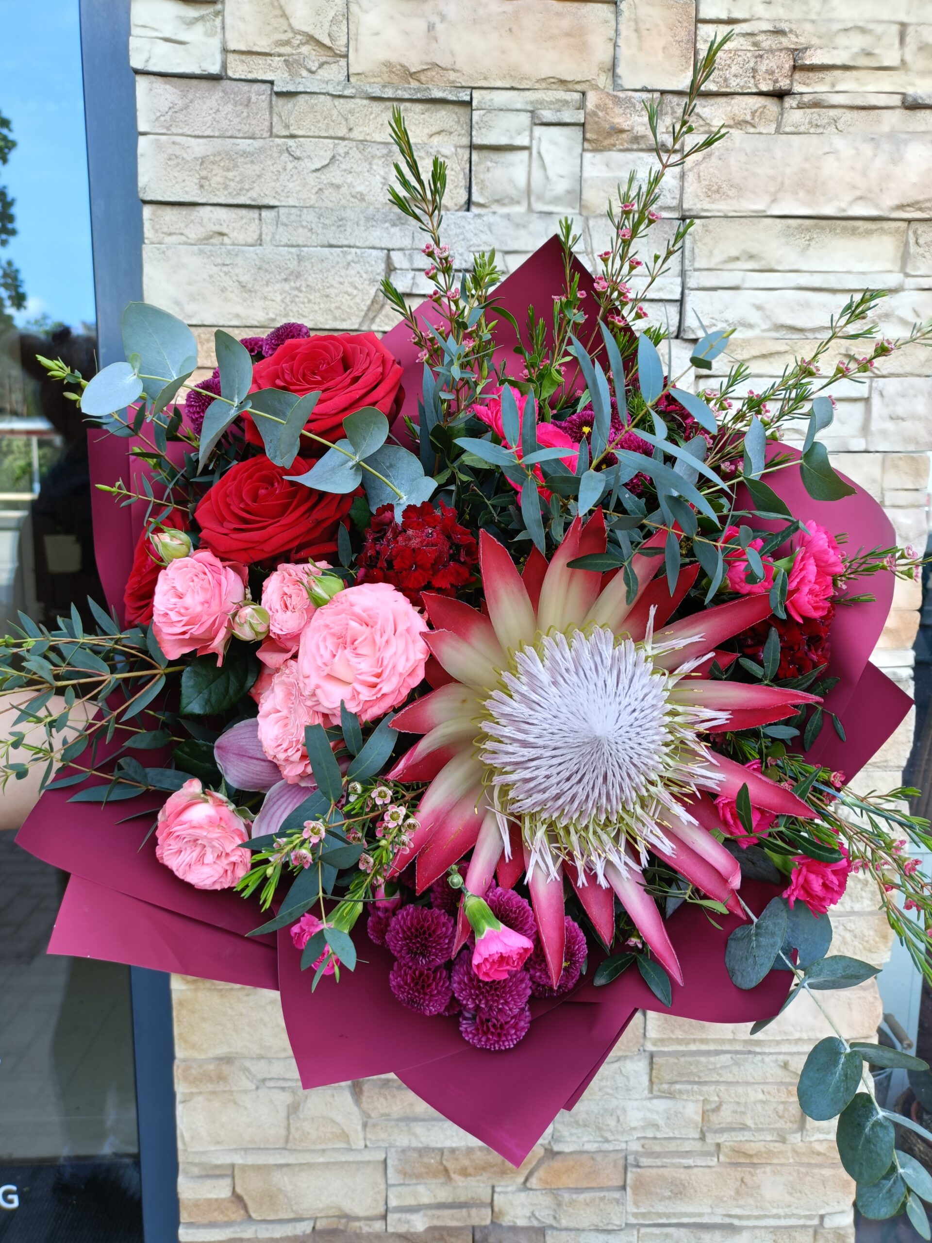 Bukiet Siła i Delikatność- Unikalna kompozycja łącząca majestatyczną proteę- symbol odwagi i niezwykłości – z klasycznym pięknem róż i goździków. Ten kontrast tworzy bukiet pełen charakteru, który zachwyca zarówno formą, jak i przesłaniem.  Protea przyciąga wzrok swoim egzotycznym wyglądem, a róże wnoszą do kompozycji nutę romantyzmu i elegancji. Całość dopełniają starannie dobrane dodatki, tworząc nowoczesny, stylowy bukiet na każdą wyjątkową okazję.