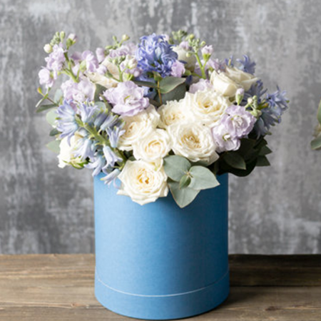 Wyjątkowa kompozycja w odcieniach bieli i błękitu, w której gałązkowe białe róże łączą się z eterycznym delfinium i aromatycznym eucaliptusem. Ten flower box to kwiatowy wyraz czystości, spokoju i subtelnych emocji. Idealny jako dekoracja wnętrza w stylu minimalistycznym lub romantycznym.