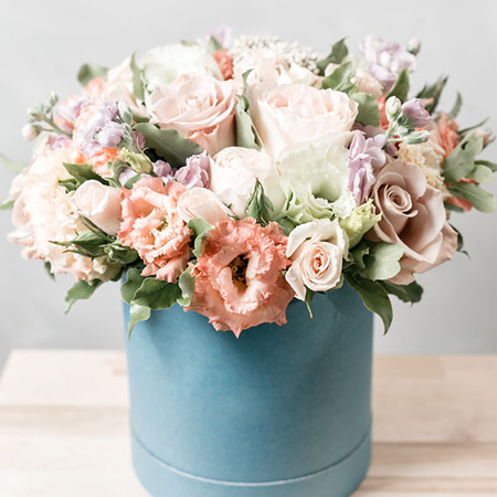 Kompozycja złożona z delikatnych eustom i klasycznych róż w pastelowych odcieniach różu, brzoskwini, kremu i bieli emanuje spokojem, lekkością i wdziękiem. Kwiaty starannie ułożone w eleganckim pudełku sprawdzą się jako prezent na urodziny, imieniny, Dzień Matki, ślub lub jako subtelny gest wyrażający wdzięczność i uczucia.