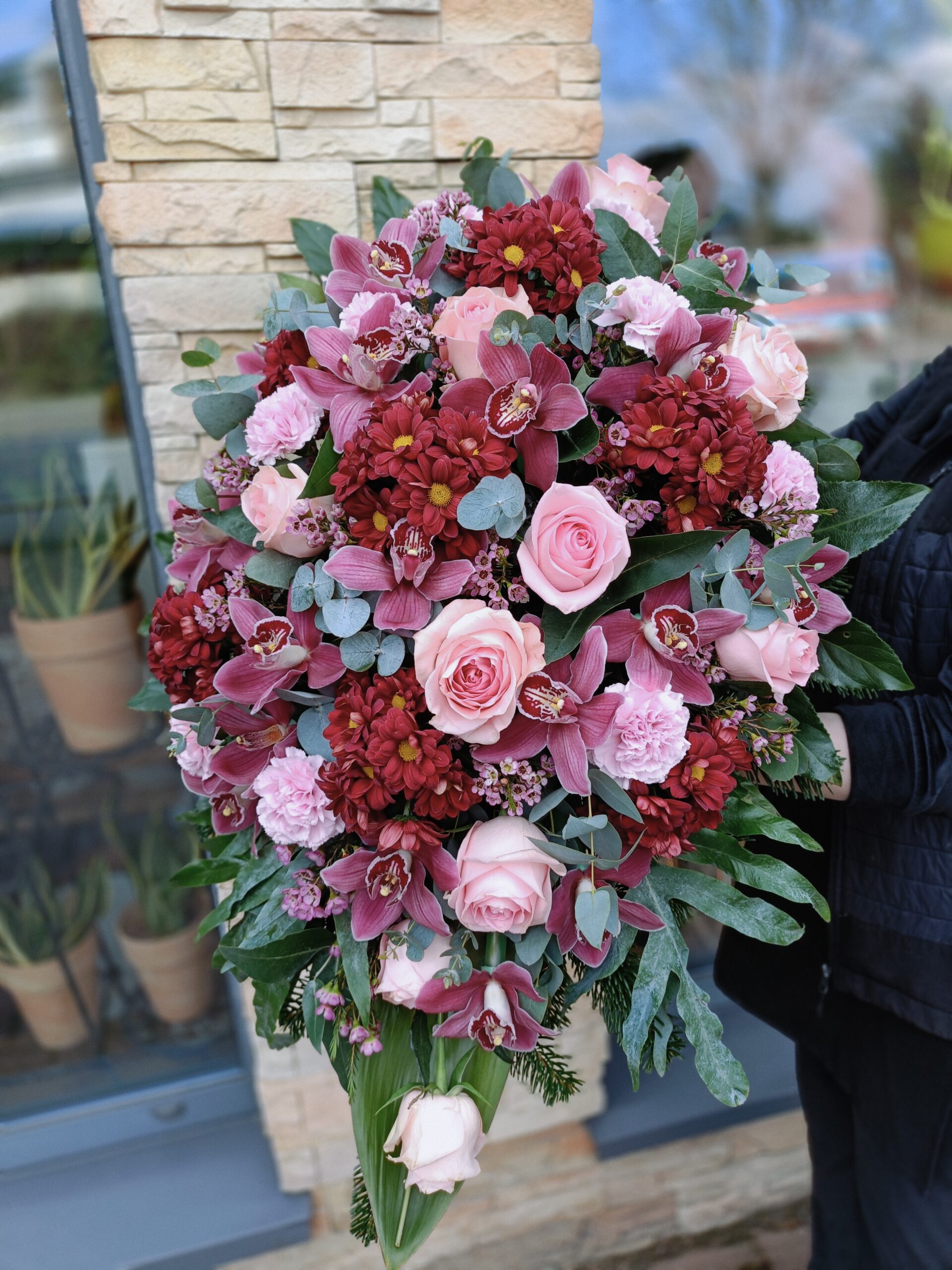 Wiązanka w kolorach różu i bordo, która łączy w sobie delikatność różowych róż i goździków z głębokimi, nasyconymi odcieniami bordowych orchidei i innych kwiatów. Zieleń liści i eukaliptusa nadaje kompozycji świeżości oraz naturalnej lekkości.