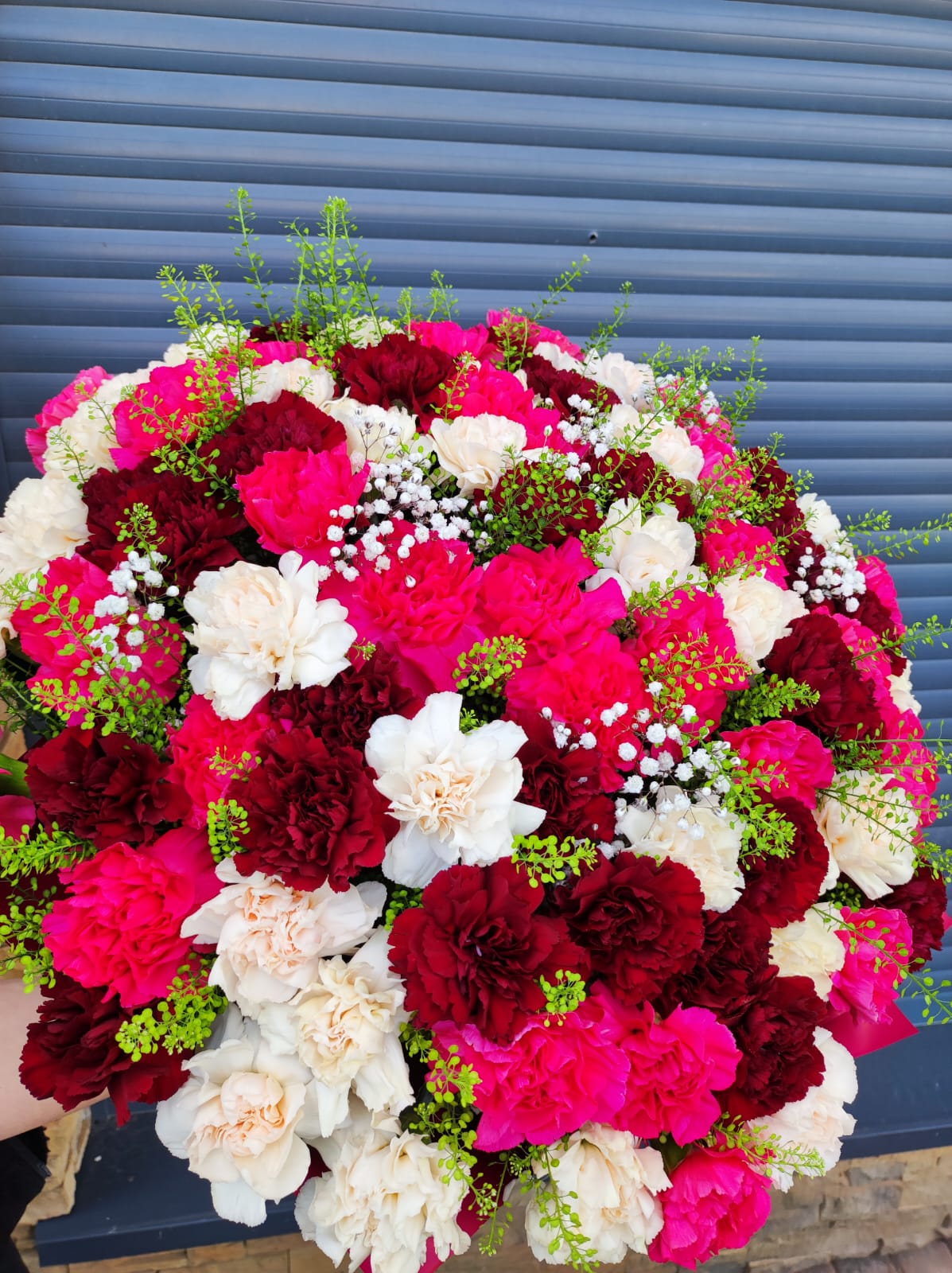 Ten przepiękny bukiet to eksplozja barw i życia, łącząca głęboką czerwień, intensywny róż oraz delikatną kremową biel. Kompozycja różnorodnych goździków w towarzystwie zielonych akcentów i białych, drobnych kwiatów tworzy harmonijną i pełną energii aranżację. Idealny na wyjątkowe okazje, które wymagają wyrazistego, a zarazem eleganckiego akcentu. Bukiet symbolizuje radość, pasję i świeżość lata, rozświetlając każde wnętrze i serce.