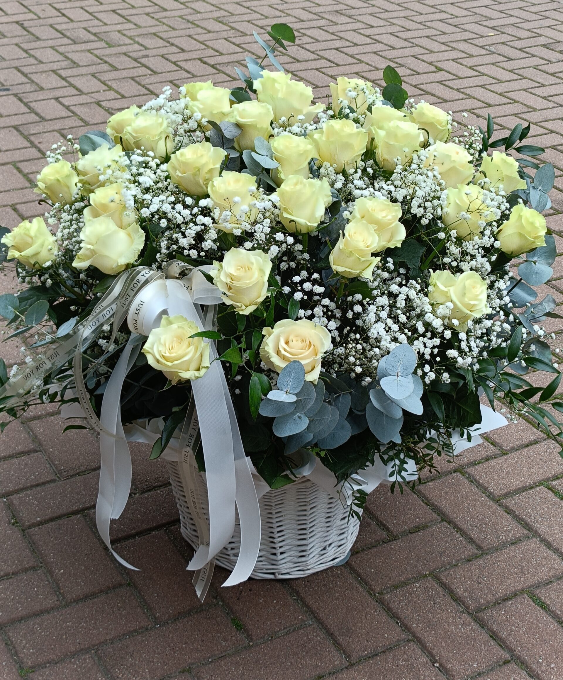 Szanowni Klienci informujemy, że ze względu na dostępność i sezonowość kwiatów, kompozycja może się delikatnie różnić od przedstawionej na zdjęciu.