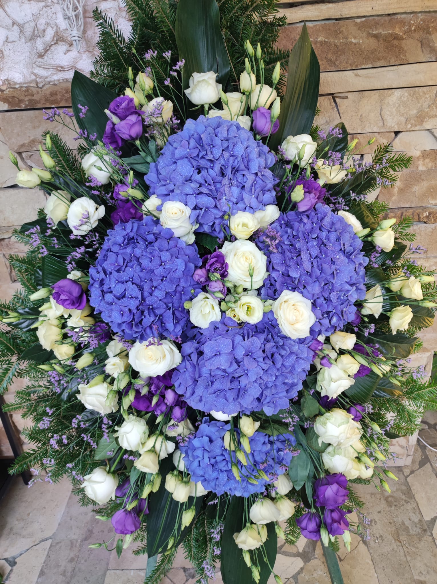 Elegancki  Wieniec pogrzebowy utrzymany w stonowanej, a zarazem wyrazistej kolorystyce. Centralnym punktem kompozycji są duże, niebiesko-fioletowe hortensje, symbolizujące spokój, wdzięczność i głębokie uczucia. Otaczają je delikatne, kremowo-białe róże oraz eustomy, które wnoszą nutę czystości i ukojenia. Dodatkowe akcenty w postaci fioletowych kwiatów oraz zielonych liści i paproci dodają kompozycji głębi i naturalnego uroku. Całość tworzy harmonijną, pełną szacunku formę idealną na uroczystość pożegnalną.