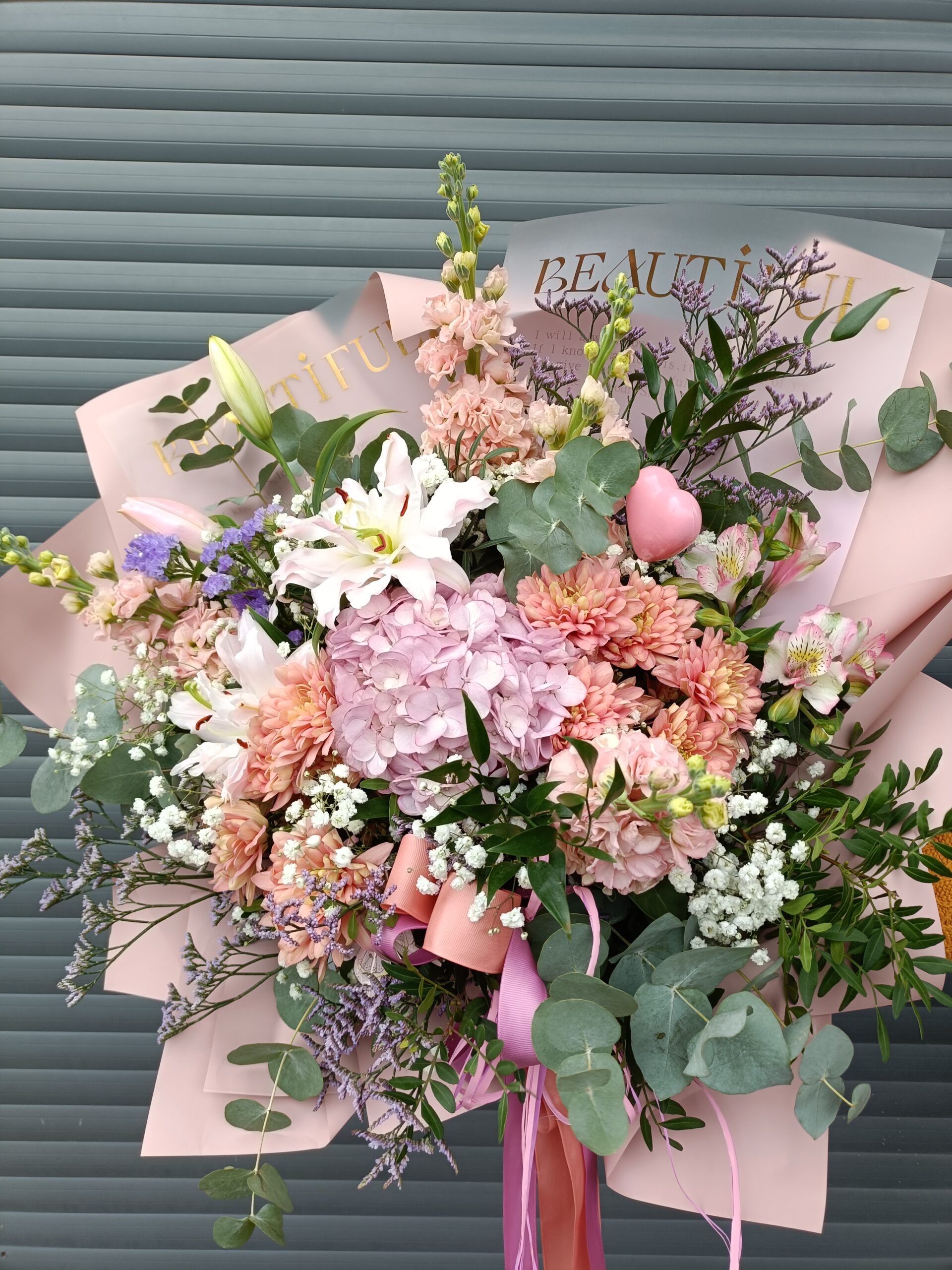 Pastelowe Marzenie to bukiet pełen subtelności i elegancji, w którym dominują pudrowe odcienie różu, fioletu i bieli. Główne role odgrywają hortensje, lilie, goździki, margarytki oraz drobne kwiaty wypełniające. Bukiet wzbogacony został o dekoracyjne liście oraz romantyczne dodatki w postaci różowych wstążek. Całość została ułożona w papierze o pastelowym odcieniu różu. Idealny na urodziny, rocznice, baby shower lub jako prezent dla osoby, której chcemy przekazać ciepło i piękno chwili.