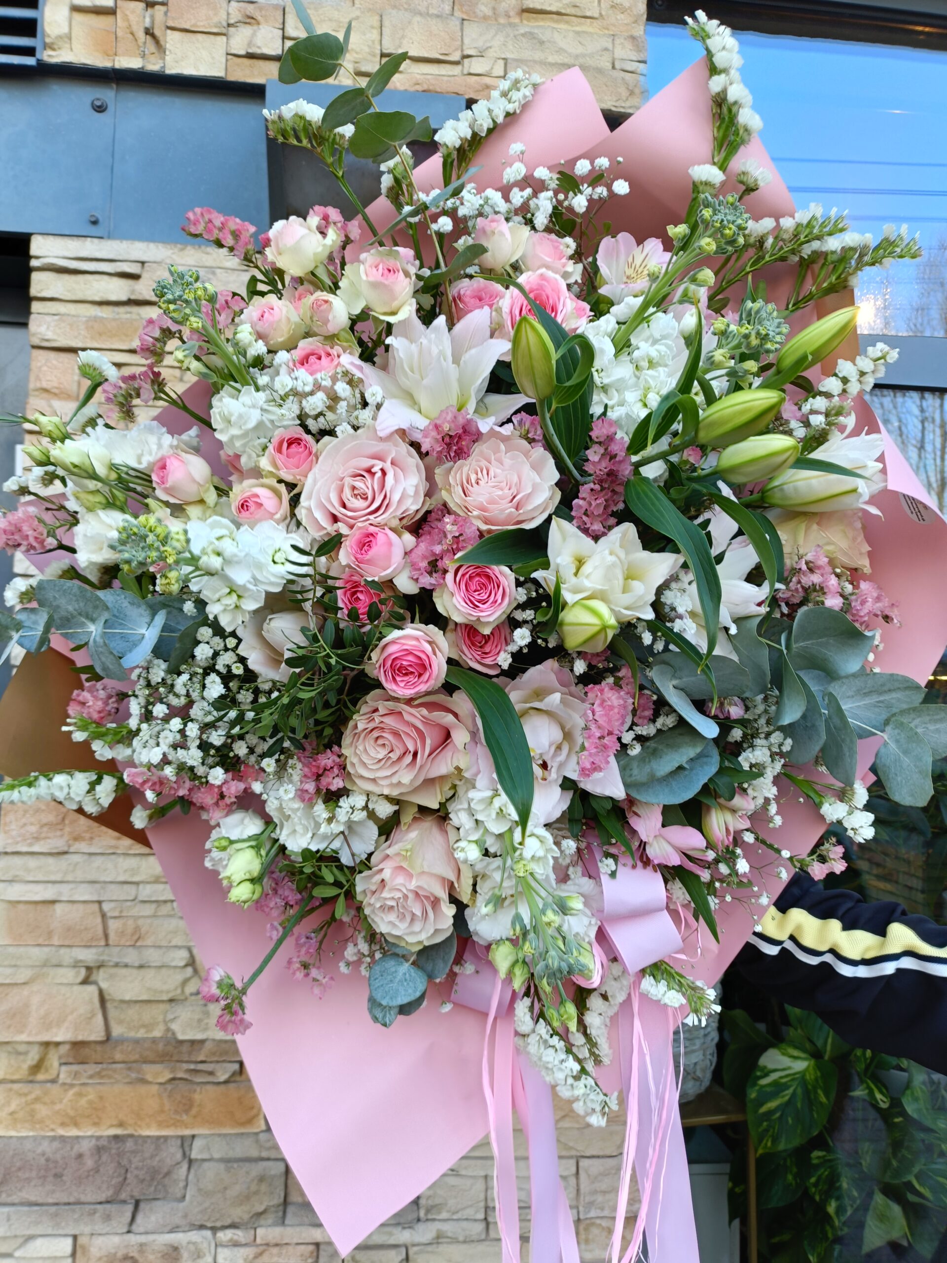 Bukiet Kwiatowa Polana to efektowna i romantyczna kompozycja w delikatnych odcieniach róż i bieli, idealna na wyjątkowe okazje. W bukiecie dominują różnorodne odmiany róż – od kremowych po intensywnie różowe – uzupełnione o lilie, gipsówkę, eustomy i zatrwian. Zieleń eukaliptusa i delikatne liście nadają całości świeżości i naturalnego wyglądu. Wszystko zostało starannie ułożone i owinięte w pudrowo-różowy papier, tworząc elegancką formę. To idealny bukiet na ślub, rocznicę, Dzień Matki lub jako subtelne wyznanie miłości i podziwu.