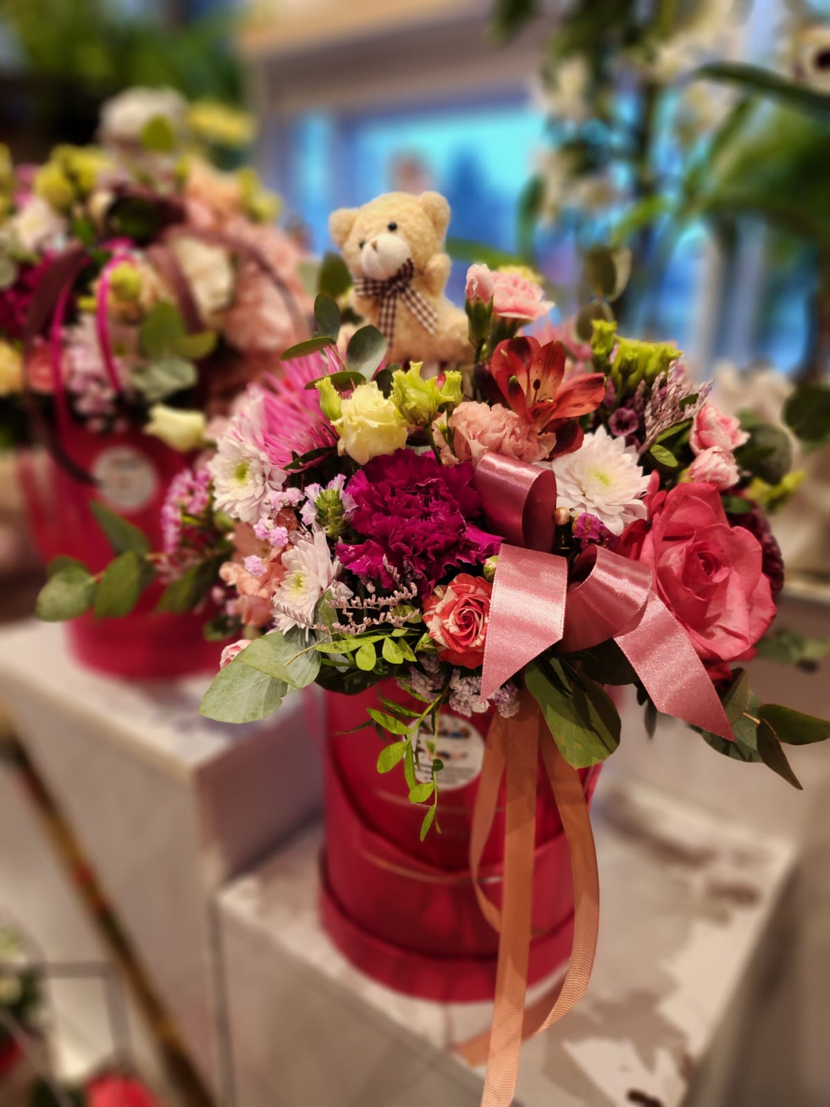 Box Słodka Niespodzianka to pełna uroku kompozycja, która łączy radosne kolory kwiatów z ciepłem małego pluszowego misia. W intensywnie różowym pudełku znajdują się m.in. róże, alstromerie, margarytki, eustomy i goździki w odcieniach różu, burgundu, bieli i żółci. Ozdobne wstążki dodają elegancji, a uroczy miś siedzący wśród kwiatów sprawia, że całość nabiera bajkowego, charakteru. Ten bukiet idealnie sprawdzi się jako prezent na urodziny, baby shower lub jako ciepły gest bez okazji – by sprawić komuś uśmiech.
