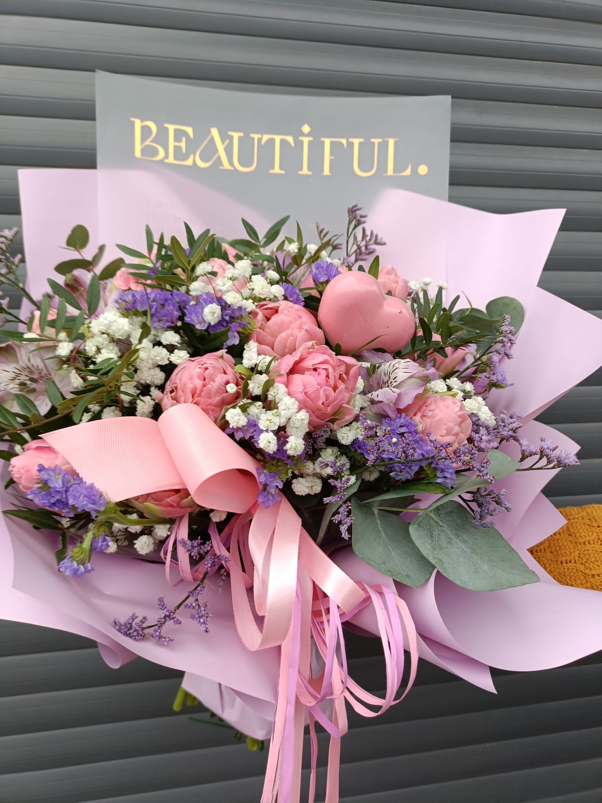 Słodka Symfonia to bukiet, który zachwyca delikatnością i harmonią pastelowych barw. Różowe tulipany (Strawberry Cream) stanowią serce kompozycji, otoczone fioletowym limonium, białą gipsówką oraz subtelną zielenią liści. Różowe wstążki dodają całości romantycznego uroku, czyniąc ten bukiet idealnym prezentem dla bliskiej osoby. Całość opakowana w elegancki, różowy papier podkreśla wyjątkowość i estetykę tej kompozycji.