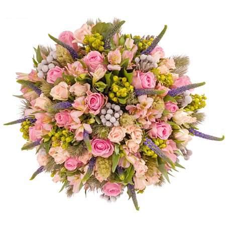 Bukiet subtelny róż składa się z różnego rodzaju róż utrzymanych w różowych odcieniach, alstromerii, veronici, zieleni dekoracyjnej.