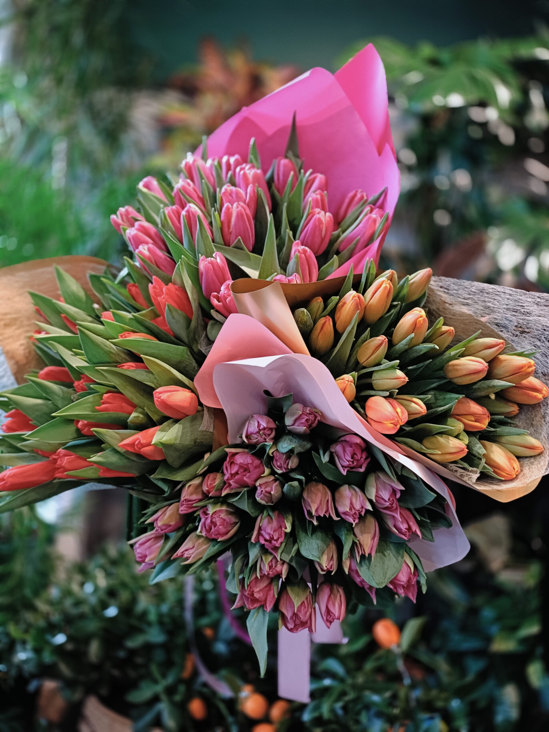 Tulipanowa Rapsodia to energetyczny i radosny bukiet składający się z tulipanów w różnych odcieniach różu, czerwieni i pomarańczu. Starannie ułożone, zamknięte pąki symbolizują świeżość, odrodzenie i optymizm, a ich dynamiczna forma wprowadza lekkość i naturalną elegancję. Ten bukiet to doskonały wybór na wiosenne okazje, urodziny lub jako spontaniczny prezent, który wniesie do wnętrza promień słońca i pozytywnej energii.