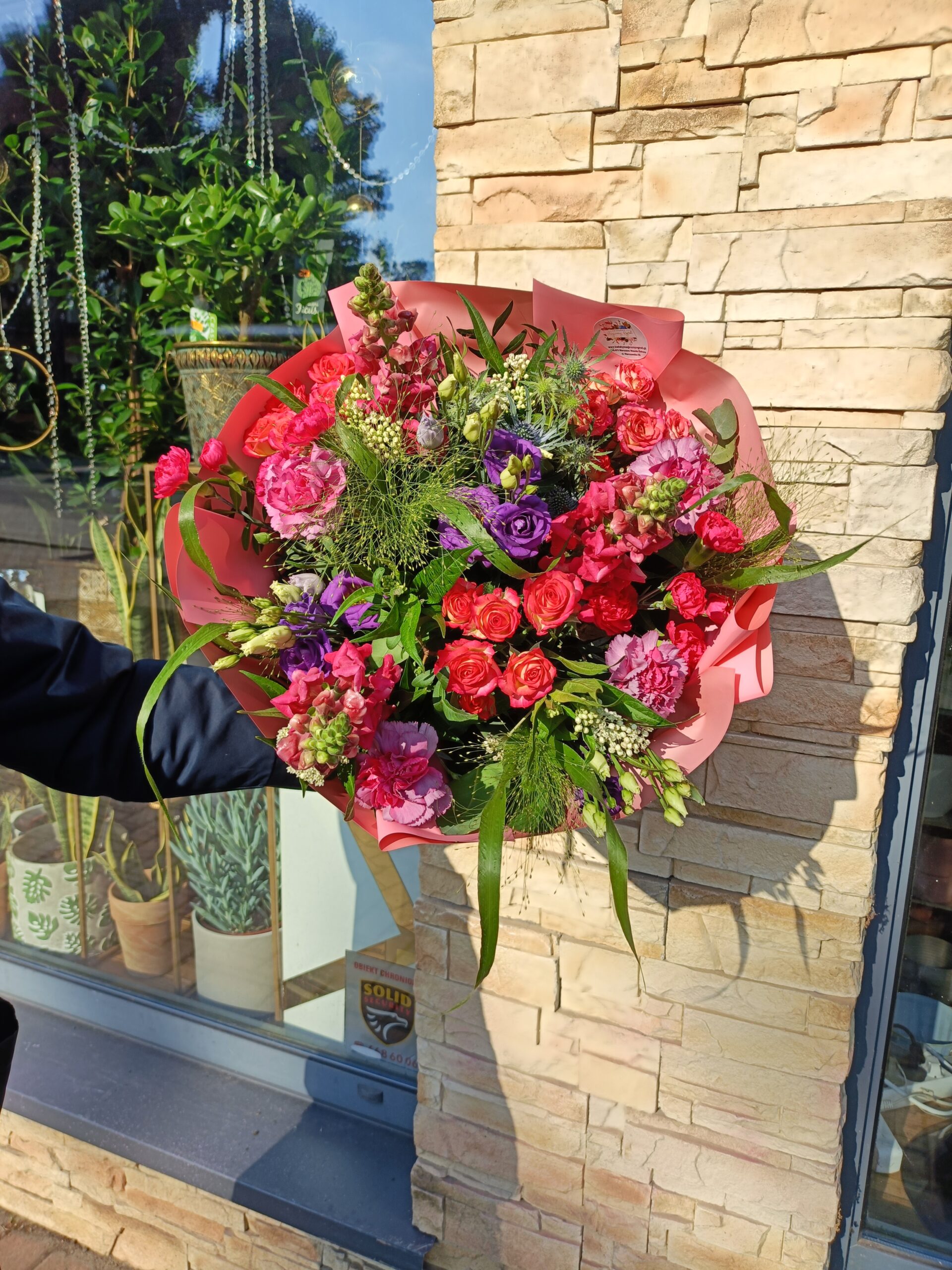 Bukiet Pink Amour to intensywne głębokie kolory, dominuje  tu  fiolet, róż, odcienie czerwieni oraz soczysta zieleń. Wśród kwiatów można dostrzec róże, eustomy, goździki, lwia paszcza i inne sezonowe rośliny, które razem tworzą dynamiczną i zaskakującą kompozycję. Całość spowita jest dekoracyjnym różowym papierem, który nadaje lekkości i wdzięku. Ten bukiet to doskonały wybór na prezent z okazji urodzin, Dnia Kobiet czy po prostu jako kolorowy wyraz serdeczności.