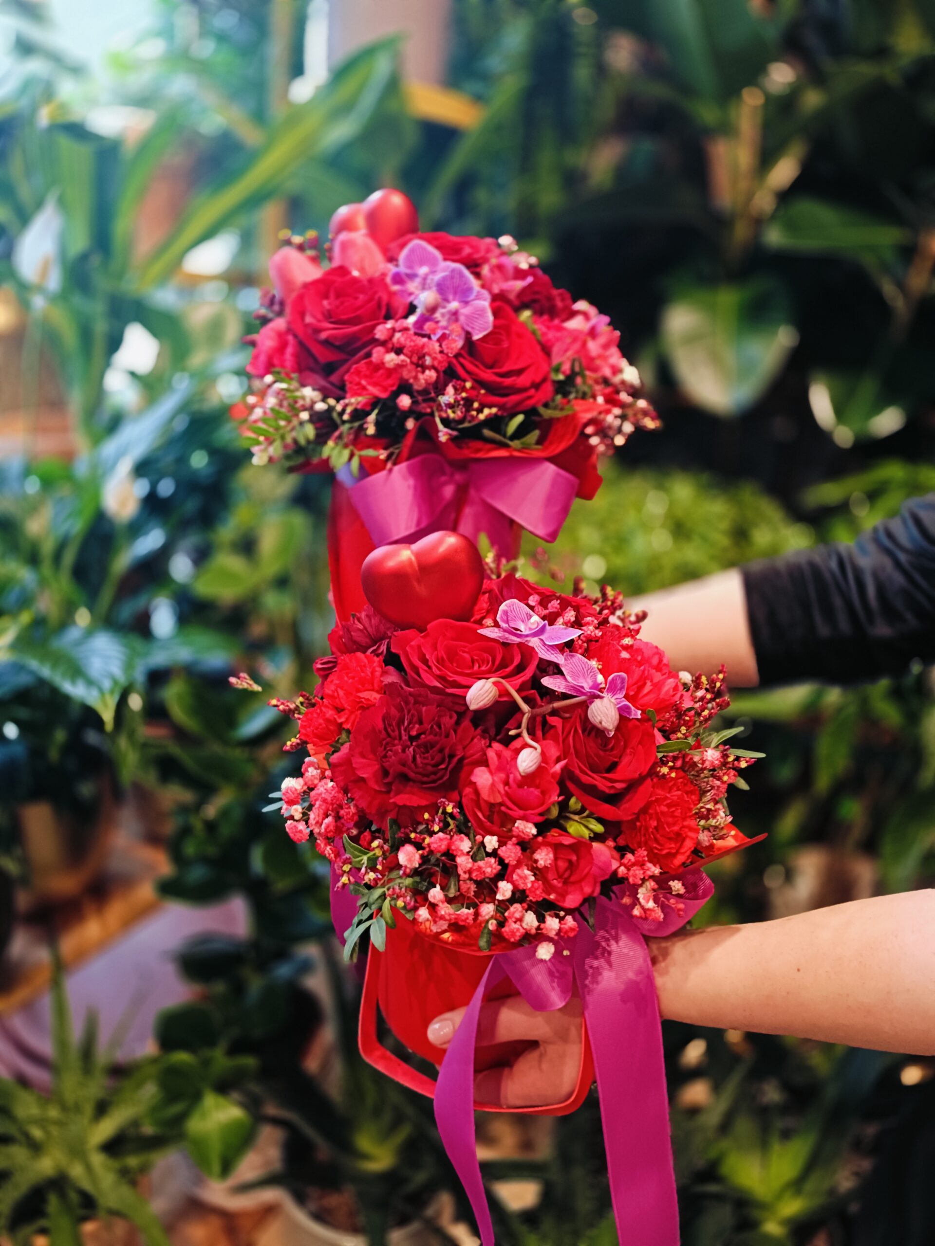 Box Velvet Desire to pełna emocji i intensywnych kolorów kompozycja idealna na wyznanie uczuć. Dominują w niej głębokie czerwienie róż i goździków, przełamane różowymi akcentami gipsówki i orchidei. Uwagę przyciągają dekoracyjne serduszka oraz eleganckie, satynowe wstążki w kolorze fuksji, które podkreślają romantyczny charakter bukietu. Kwiaty ułożone są w eleganckim, czerwonym pudełku. To idealny wybór na Walentynki, rocznicę lub inne wyjątkowe chwile.